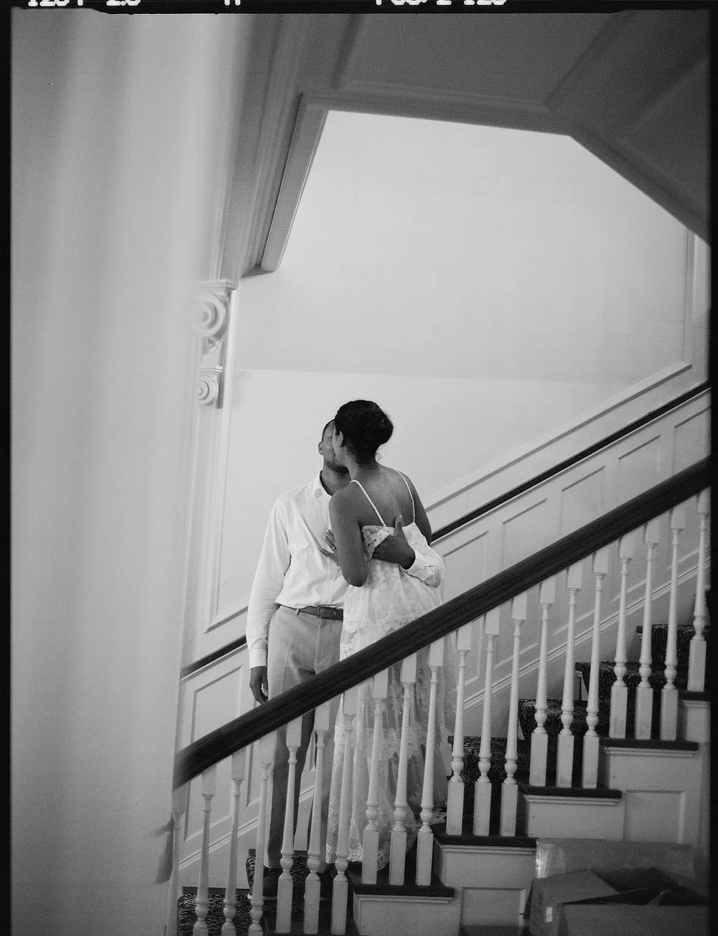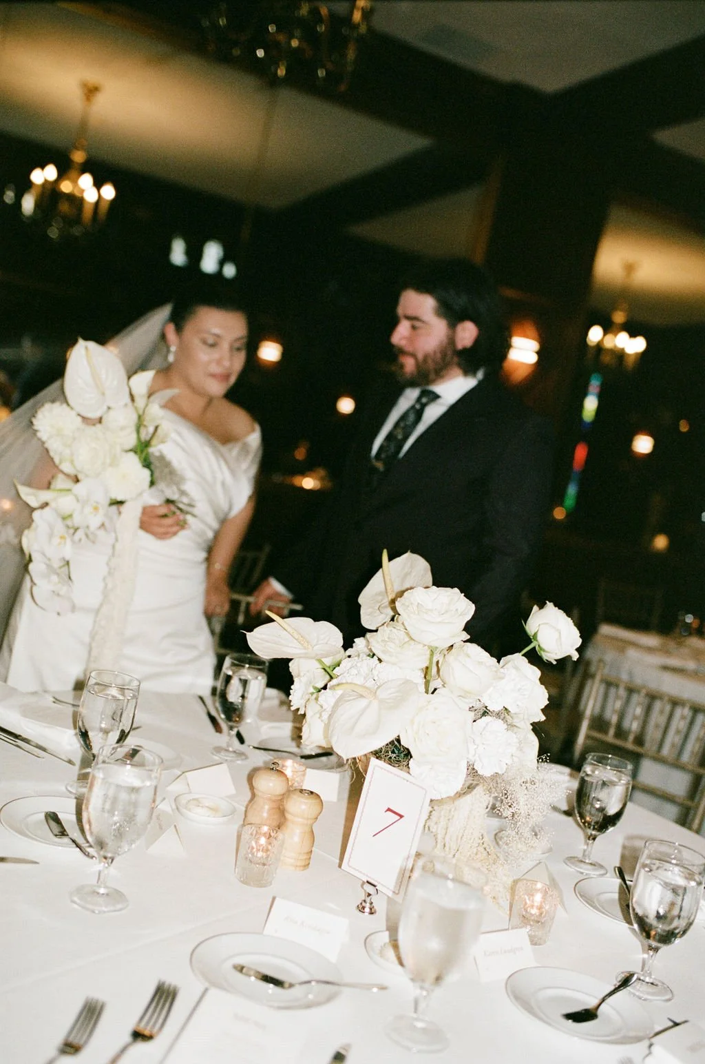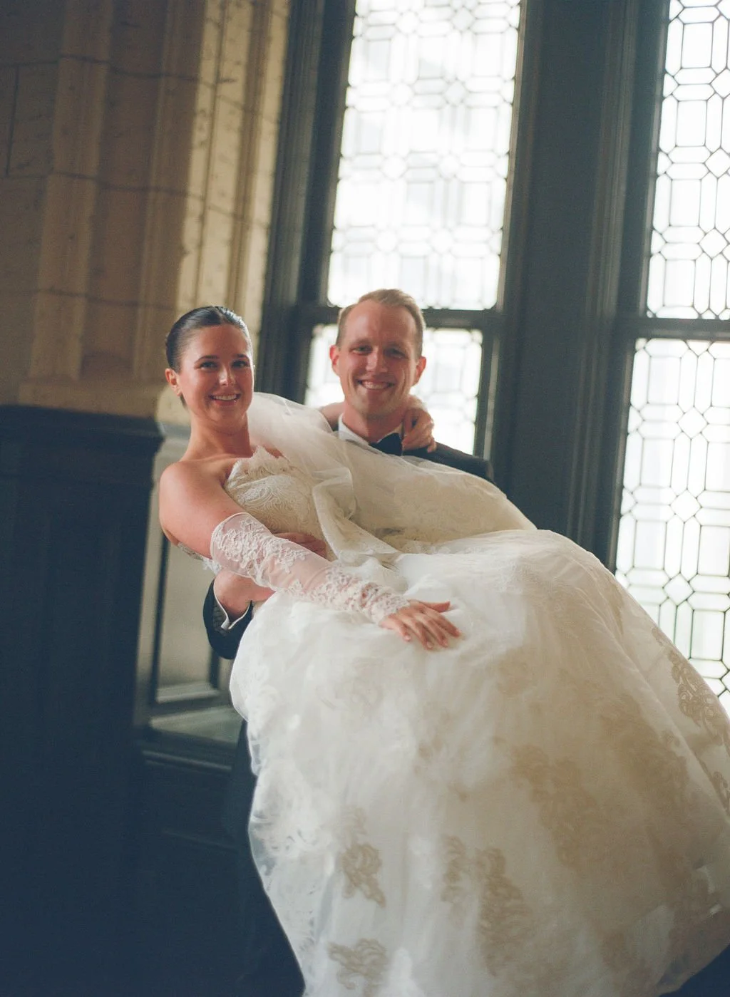 A wedding with old money vibes! Chandeliers, and historic Kansas City charm adorn this spaceβ what more could you want. Huge windows, stone, low light, and a total vibe. Whether you lean into flash photos or are going for a low light, candle lit reception, film will give you an opulent ambiance and enhance the wine educed dance floor photos.