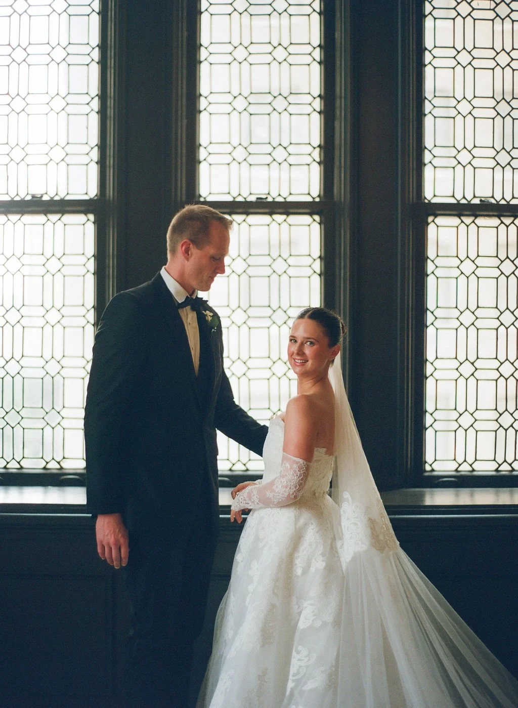 Romantic, ethereal, and elegant for all your hotel wedding dreams. When I shoot film at Hotel Kansas City, I lean into the light of the environment. The sun glowing through the windows casting rainbows on the floor, the stained glass windows in the ball room, or the glow of candles and lamps on guest tables. Low light as a film photographer takes patience, skill, and steady hands. If you are hoping for soft grain, emotion, and nostalgia, film is perfect for a wedding at Hotel Kansas City.